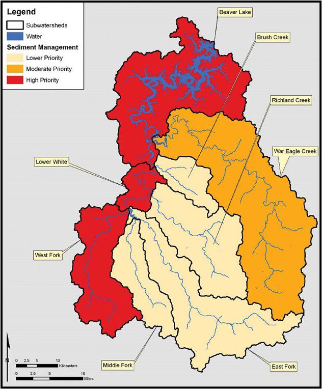 According to the Beaver Lake Watershed Protection Strategy (Strategy), future annual sediment loading is estimated to increase 21 percent or almost 50,000 tons per year. Without additional protective measures, stream channel erosion is estimated to contribute most (approximately 60 percent) of the sediment load to Beaver Lake. While the decrease in areas categorized as agriculture, pasture, and forest will reduce sediment loading by around 18,400 tons/year from those sources, channel erosion and land developed as low density residential tracts are estimated to increase sediment contributions by approximately 28,850 and 36,700 tons/year, respectively. By 2055, the total phosphorus in the lake is expected to increase by approximately 24,000 pounds per year. As with sediment, the Beaver Lake and War Eagle Creek subwatersheds are predicted to be the largest sources of phosphorus to the lake. The War Eagle Creek subwatershed is predicted to deliver the largest nitrogen load under both existing and future scenarios (See Figures 3 and 4). War Eagle Creek is also listed by the Arkansas Division of Environmental Quality as an impaired stream due to increased siltation and nutrients.