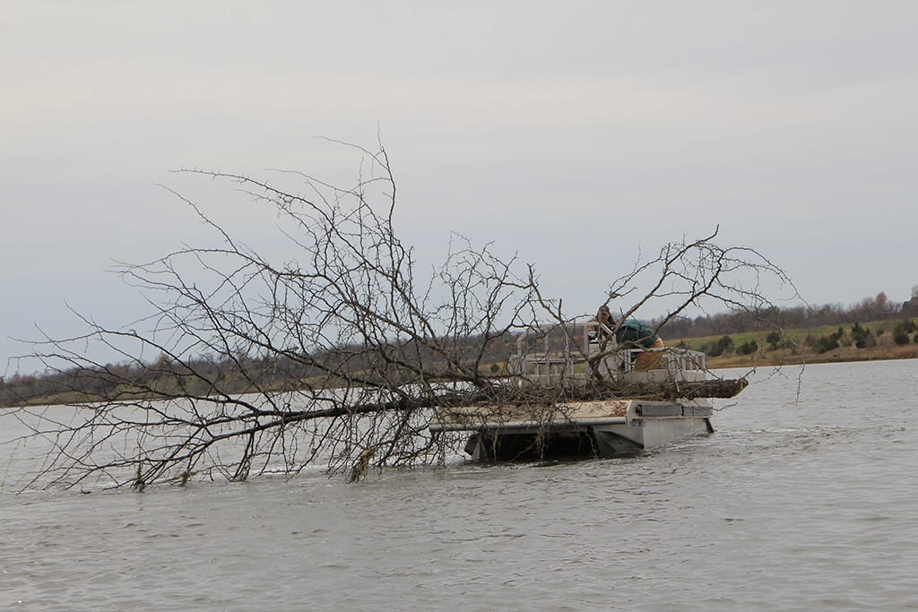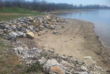 This project established/enhanced suitable aquatic habitat resulting in protection of eroding shorelines, increased angler-fish interactions, improved angler access, and enhanced recruitment of multiple fish species that will lead to improved lake health, increased wildlife-related recreation opportunities, and strengthened local economies. Eroded shorelines (1400′) were armored with 2,786 tons of rip-rap on the lake’s most highly eroded banks. The stabilization of the shoreline improved water quality, stopped erosion, and provided places for fish to spawn, feed, and rest. Rock installation was done entirely from shoreline access points around the lake. This project also included the installation of hard, woody cover in the form of approximately 30 large hardwood brush piles consisting of 5-10 trees per brush pile. Entire trees, large stumps, and large tree tops taken from Mozingo Park property were used to construct brush piles on shallow, as well as deep lake contours. Hard, woody cover provides excellent nursery sites for young-of-the-year fishes in shallow water, as well as furnishing excellent fish habitat and fish attracting structure in deeper locales that will lead to increased angler success. Details of the Mozingo Lake project were presented at the 2016 Reservoir Fisheries Habitat Partnership Annual Meeting.